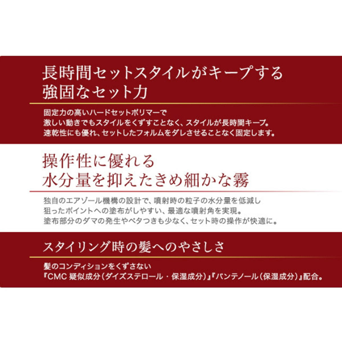 速乾性にも優れ、セットしたフォルムをダレることなく固定します。