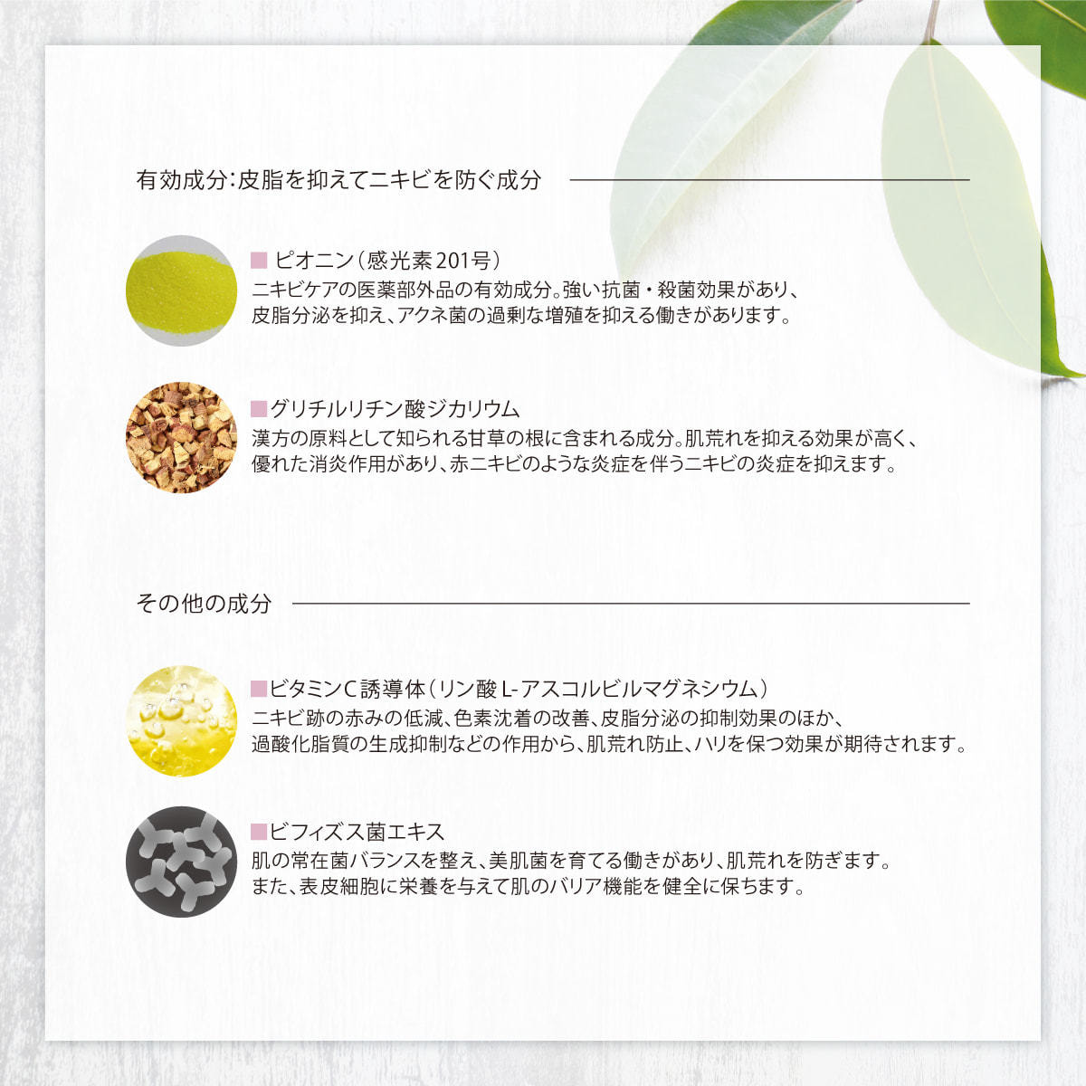 強い抗菌・殺菌効果があり、皮脂分泌を抑え、アクネ菌の過剰な増殖を抑える働きがあります。